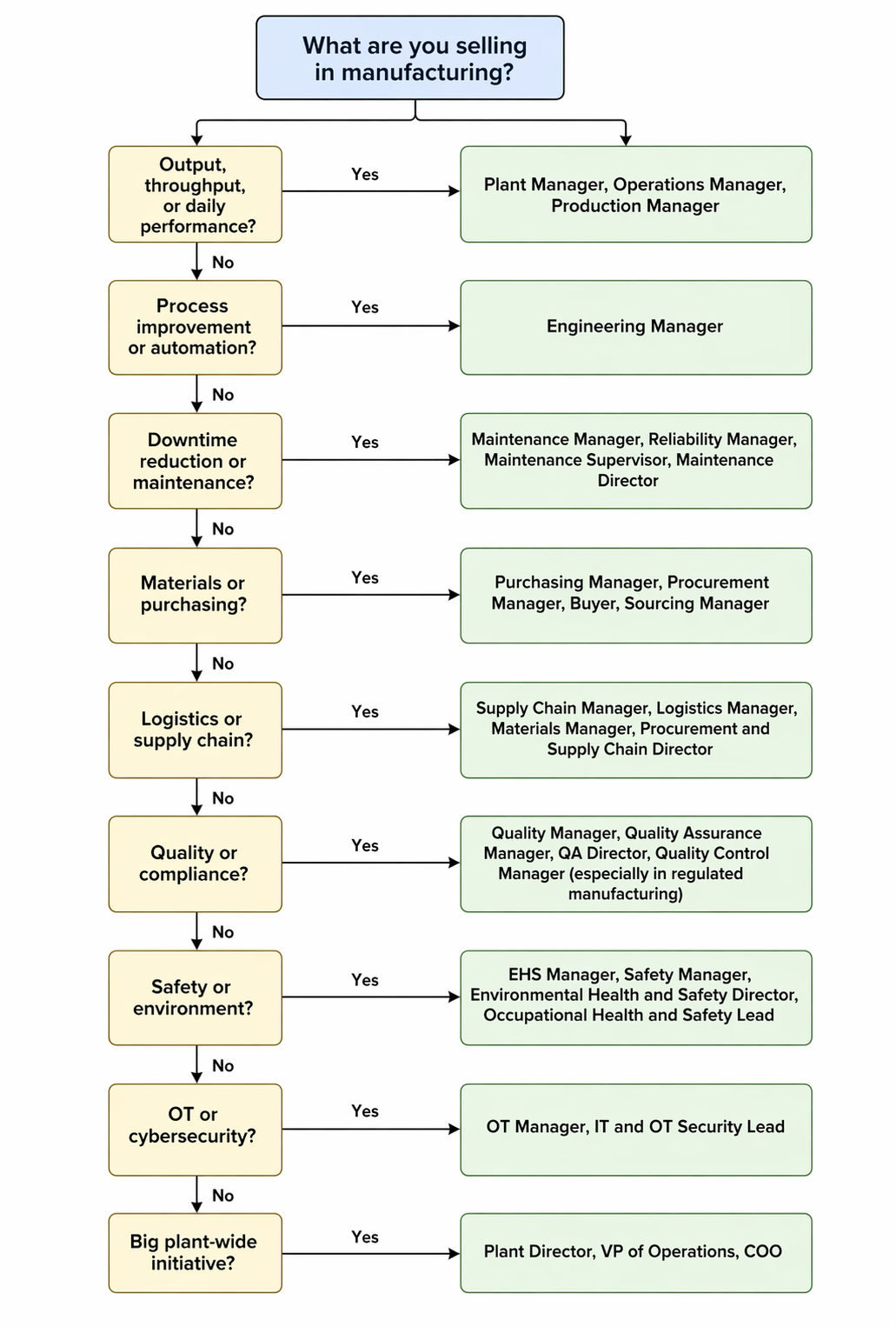 No. The best first contact depends on what you sell. If your offer helps output, scheduling, or line performance, the plant manager may be the right person. If it is about downtime, quality, safety, procurement, or plant systems, another role may be a better fit. Use the table above to find the best person to contact based on what you are selling.